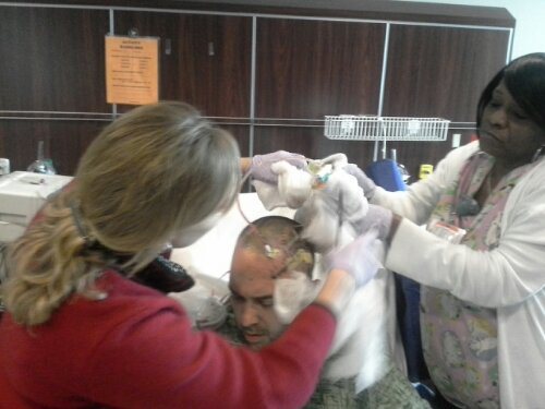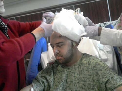 So, they took him into surgery. In pre-op they said they said they would use the same incision. The surgeon did not “mark” his incision so we had to wait for that to happen. The surgeon was correct in saying that the bleeding (seepage) was from his surgery last Thursday and was general swelling and putting pressure on his brain. They removed the same piece of skull they removed last Thursday to put in a drain to relieve the pressure.