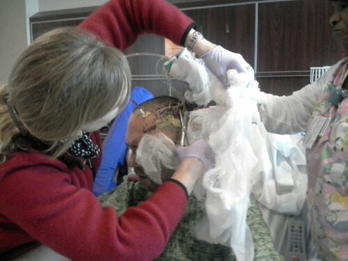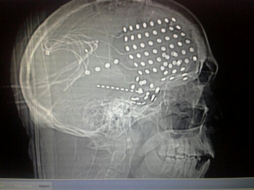 The Surgeon came in next and pretty much said “I am sure the bleeding is between the skull and the brain. He showed us his scan. The dots are the EEG leads which are being mapped.
